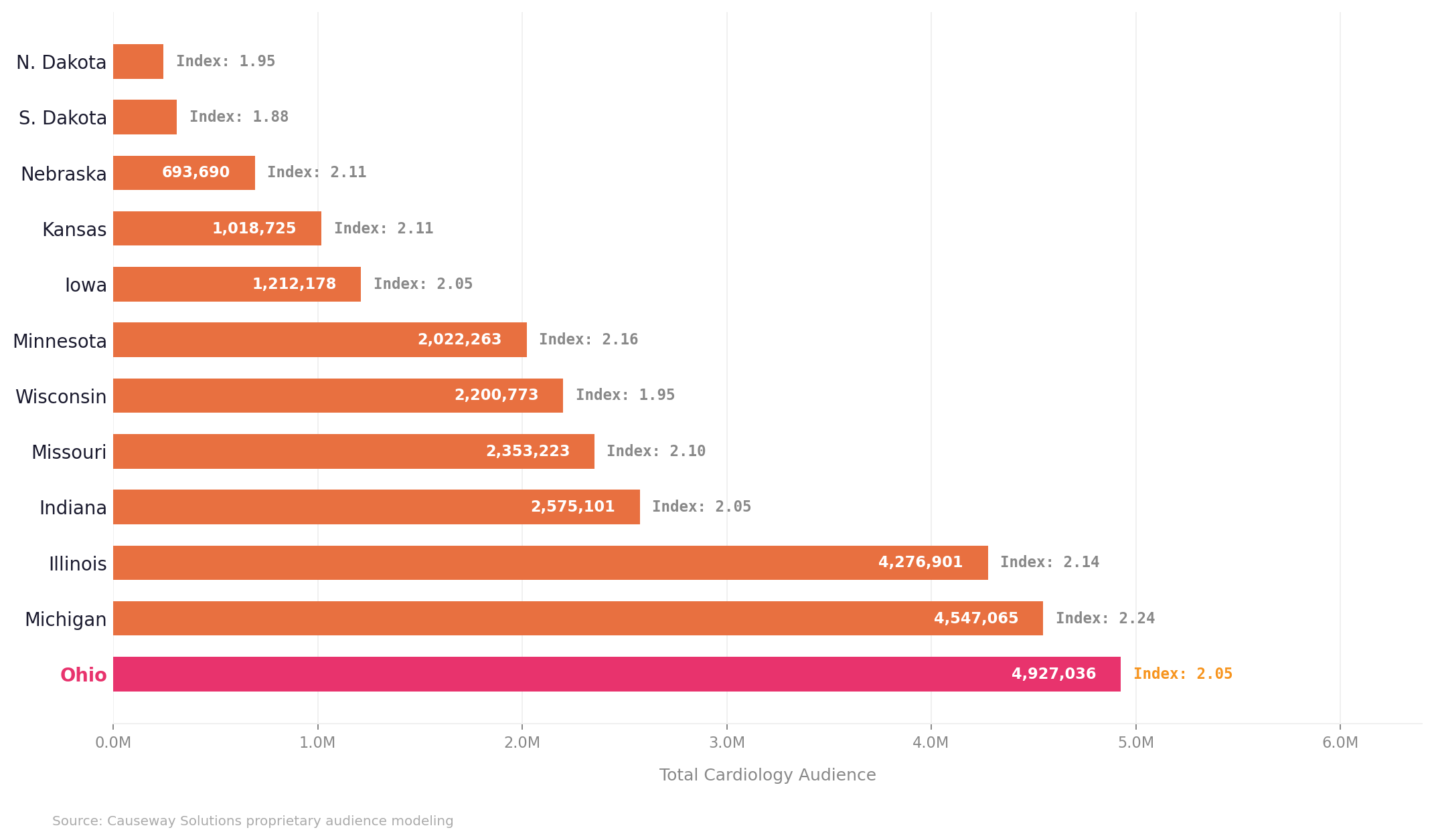 The next logical expansion targets share a common profile: large aging populations, high rates of cardiovascular disease, and substantial addressable cardiology patient populations. To understand where that opportunity is largest in the Midwest, we analyzed cardiology patient audiences across all 12 Midwest states.