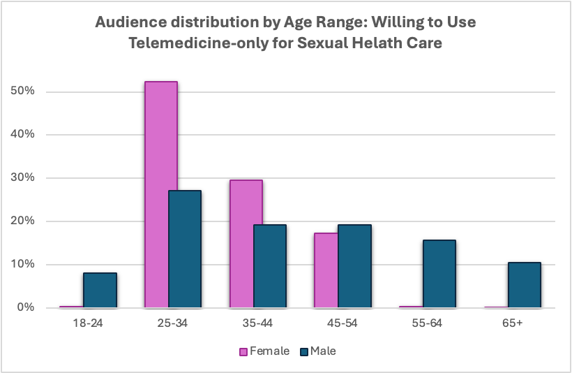 In contrast, the male audience of individuals willing to use a telemedicine only platform for sexual health consultation is much more distributed across all ages. Even in the older generations where it is often presumed that telemedicine is less appealing, more than 26% of this audience made up of men aged 55 or older. Compared to national norms, these men are more likely to correspond with convenience as their primary driver of care selection, with markedly lower emphasis on provider connection.