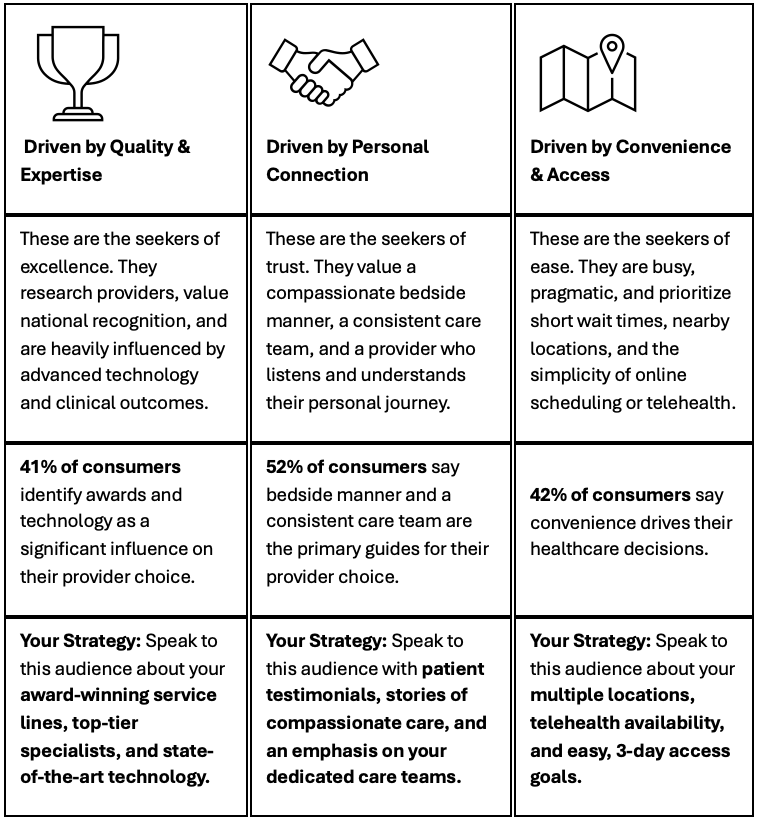 When you give everyone the same message, you're speaking to a diverse audience with different priorities. Our data reveals the true landscape of patient drivers, and as you can see, if your ad spend isn't targeted, a significant portion simply won't resonate. You're giving patients who prioritize convenience a message about quality, and those who seek connection a message about technology.